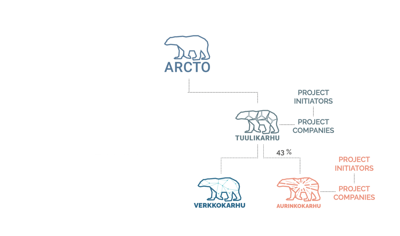 Arcto toimii emoyhtiönä yritysryhmässä, jonka tytäryhtiöt ovat aktiivisia uusiutuvan energian kehitysyhtiöitä. Arcto toimii enemmistöomistajana Tuulikarhu Oy:ssä sekä vähemmistöomistajana Aurinkokarhu Oy:ssä. Olemme tällä hetkellä mukana suomalaisissa energiahankkeissa, jotka käsittävät lähes 100 tuulivoimalaa sekä noin 1,5 GW aurinkosähkö- (PV) ja akkuenergiavarastohankkeita (BESS). Lisäksi omistamme vähemmistöosuuksia valikoiduissa kansainvälisissä tuuliportfolioissa.